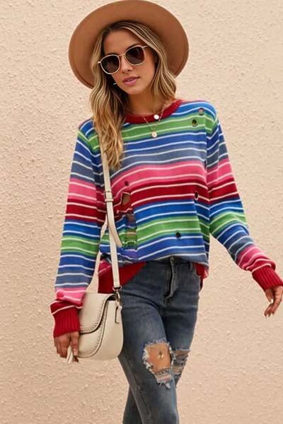 Brightly Striped Distressed Cutout Sweater